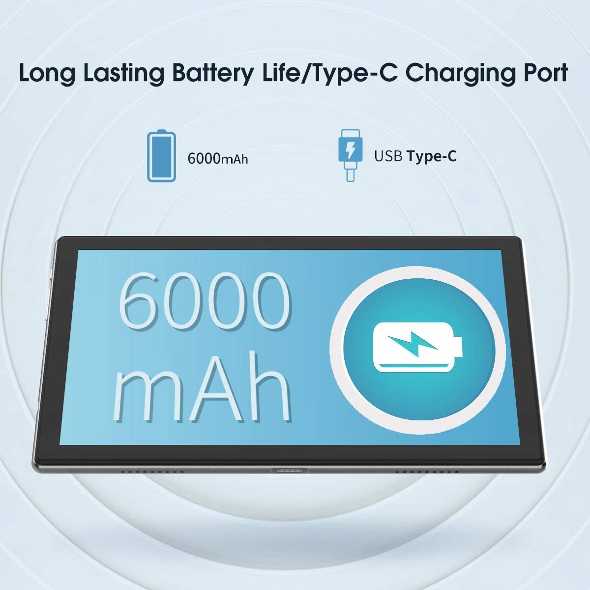【Long Battery Life】 Powered by a 6000mAh battery, the 10” tablet can stand by for up to 15 days and play video for up to 5 hours. Easily charge via the USB Type-C port and rest assured the battery will last. Video chat or snap selfies on the front camera, or document your day on the rear camera and share to social media on the ultra-fast Wi-Fi.