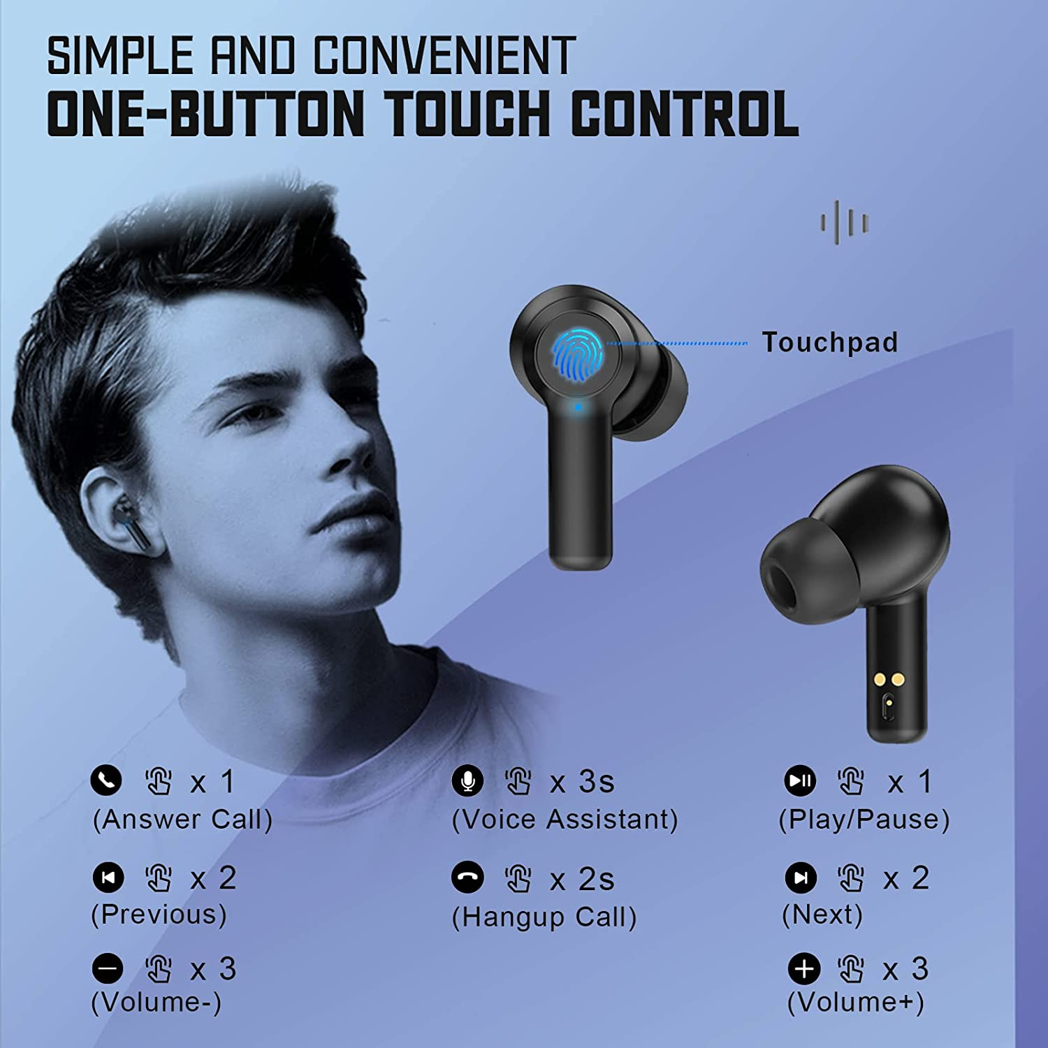 • Impressive Sound Quality: Powered by driver units with a diameter of 13mm, the wireless Bluetooth headphones have a subtle emphasis in the lower and higher frequency range, offering a deep bass and crisp, clean highs. 4 build-in mics (2 mics per earbud) and noise cancellation algorithm allow you to enjoy a HD voice call with clear and realistic sound even in a noisy place.
