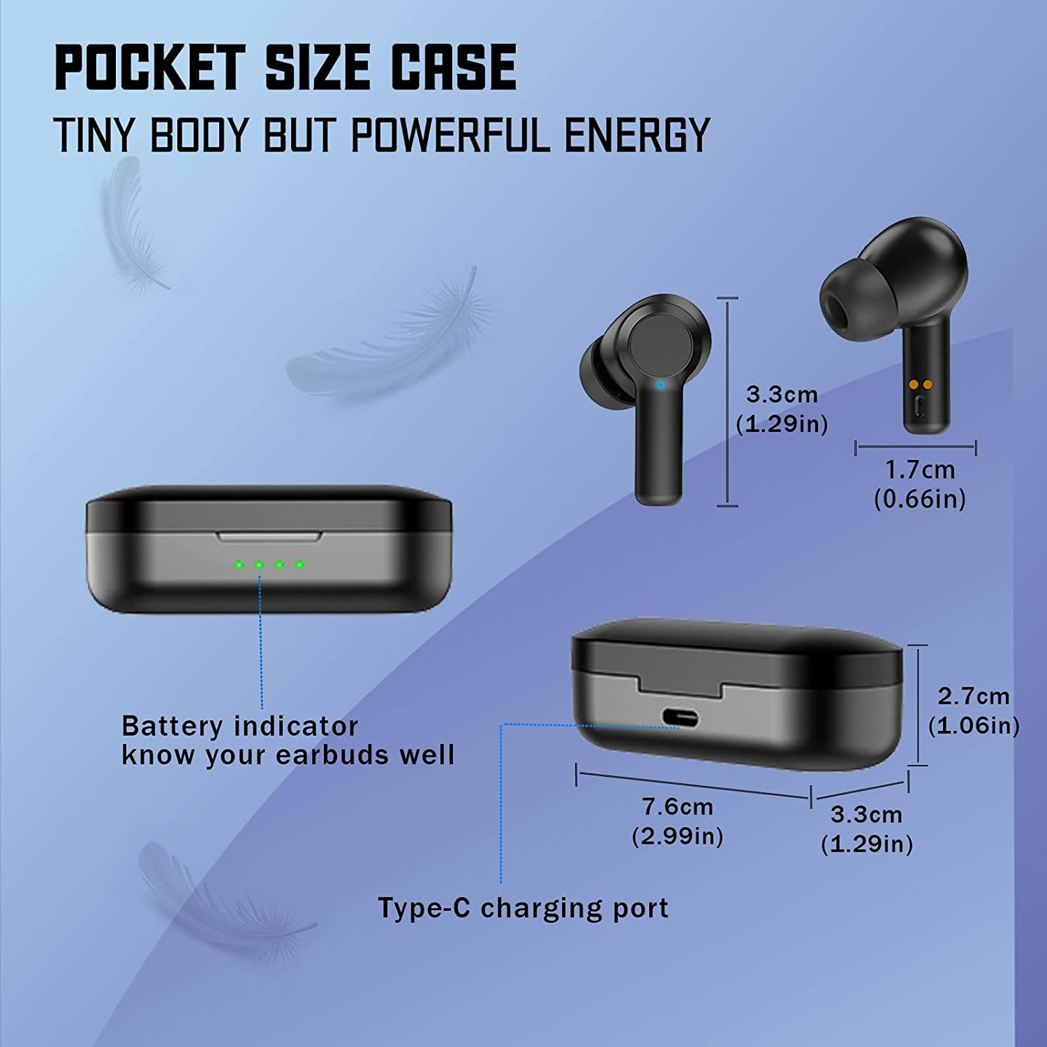 • Comfortable and Portable: The in-ear Bluetooth earbuds are designed with an ergonomic shape to fully fit your ears, making it stay steady and comfortable for long-time wearing. So you don't need to worry about them falling off when doing sports and workout like running. The Bluetooth earbuds have a pocket-sized body and 37g light weight (3.4g for each earbud) so you can take it with you anywhere and anytime.